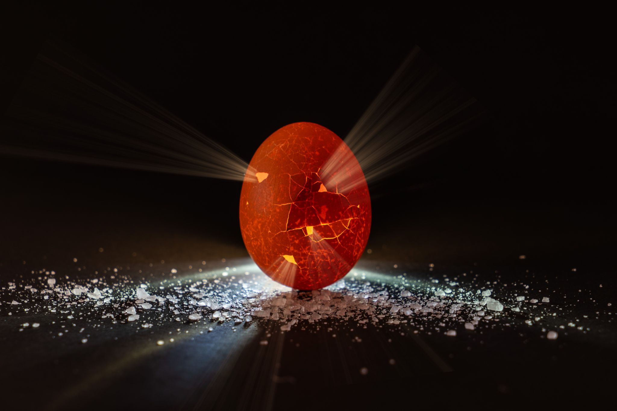 Inzwischen sind 4 Jahre vergangen, nun endlich habe ich ein neues Ei-Foto. Zuerst das rohe Ei kaputtgemacht, dann von hinten beleuchtet vor schwarzem Hintergrund. ALs Deko dann am PC noch Sonnenstrahlen dazugebastelt.